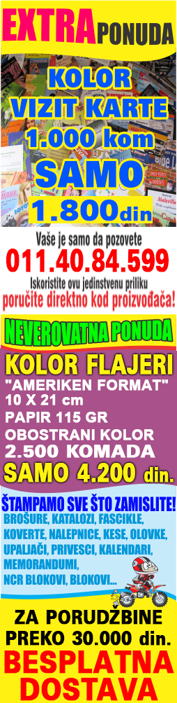 Višegodišnje iskustvo u izradi svih štampanih materijala ne dozvoljava nam da ni jedan Vaš predlog ostane nerešiv. Od najjednostavnijih vizit karti do najkompleksnijih katalog i ambalaža, izlazimo Vam u susret. Kratko rečeno - radimo sve na čemu može da se štampa do formata B2 (50 x 70 cm).